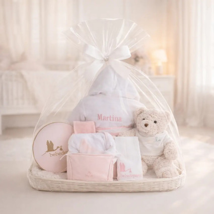 This set includes an adorable soft toy with your company logo, a personalized comforter, a pacifier cover and a bottle cover, all in 100% cotton for baby's comfort. The pajamas will also be a hit with parents as they are made from a soft muslin fabric and come in an adorable vintage box. In addition, all our layettes include a medallion with the baby's name and a dedication card. It's the perfect way to show your love