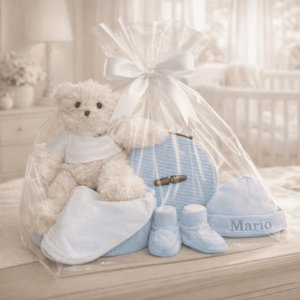 Classic essential baby hamper CUSTOMIZABLE Bebé de París C0191 100.79 £ (20 reviews) Customize the teddy’s T-shirt for free: This hamper includes free printing, so you can add the baby’s name, an image, or a logo to the teddy’s T-shirt to make it a truly unique gift. Add to cart