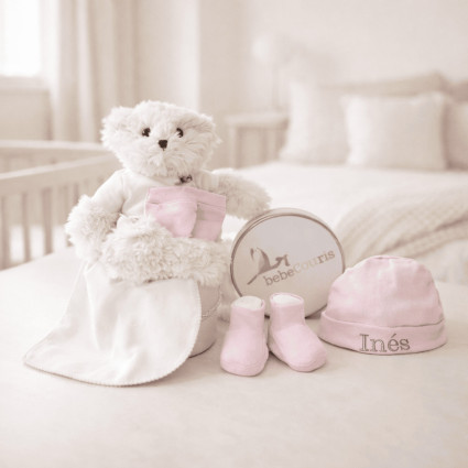 Essential Bedtime gift basket Bebé de París C104 87.56 £ This baby hamper, presented in an exclusive vintage-style box from the Serenity Essential line, becomes a truly special gift for the newborn. Perfect as a baby shower present. Nursing muslin cloth Star-print cotton pyjamas Doudou Bunny 30 cm teddy bear Vintage-style box Welcome medallion with the baby’s name Add to cart