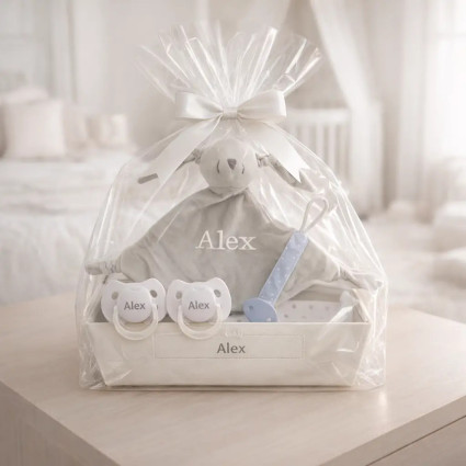 Hamper with personalised dummy and accessories for newborn CUSTOMIZABLE C357 63.60 £ (17 reviews) The perfect personalised gift featuring the baby’s name, for their exclusive and personal use. Presented on our lovely personalised tray with dummy; dummy clip to attach to the baby’s clothes and prevent it from falling on the floor or becoming lost; our friendly teddy bear, sure to become baby’s favourite companion for calm, company and rest; dummy... Add to cart